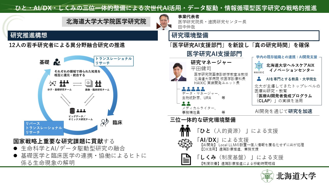 中核組織として「医学研究AI支援部門」を新設し 、AI研究開発に長けた平田健司准教授を研究マネージャーに据え、意欲ある若手研究者(PI)を強力にサポートします 。基礎研究と臨床医学が連携する「情報循環型研究」を推進し 、北大病院の全ての医師が活用できる支援システムの構築を目指します 。