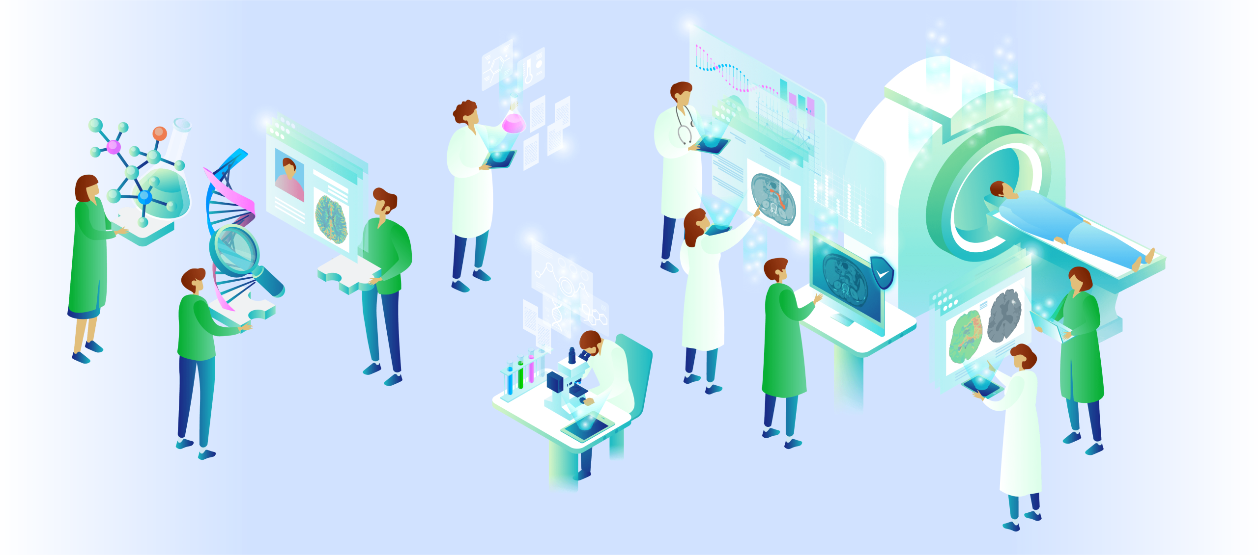 分子・基礎研究グループは、以下の5名の若手研究者で構成されています。チームの共通目標は、AIとDXを基盤に、異分野のデータを融合させて医学研究の質と効率を向上させることです。